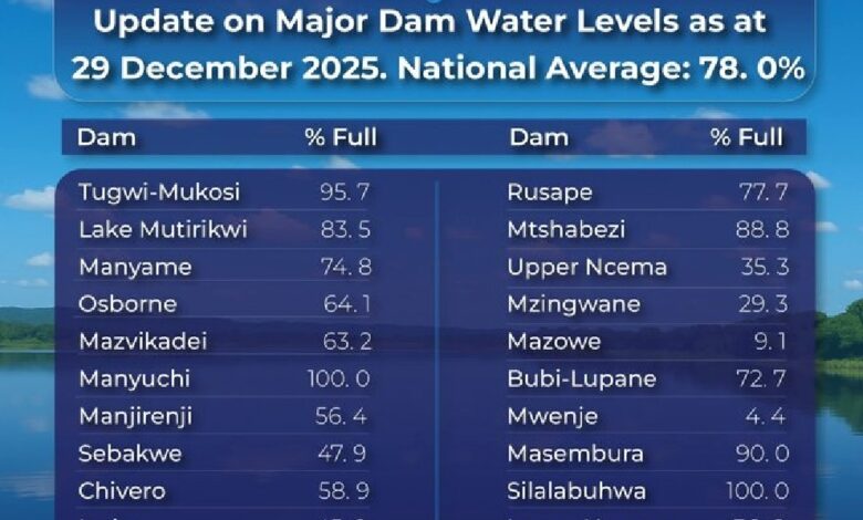 Masembura dam in Mashonaland West has risen to 90 percent, while Mtshabezi, serving Bulawayo’s water needs, stands at 88.8 percent—levels that offer relief for urban water supply but require careful monitoring.